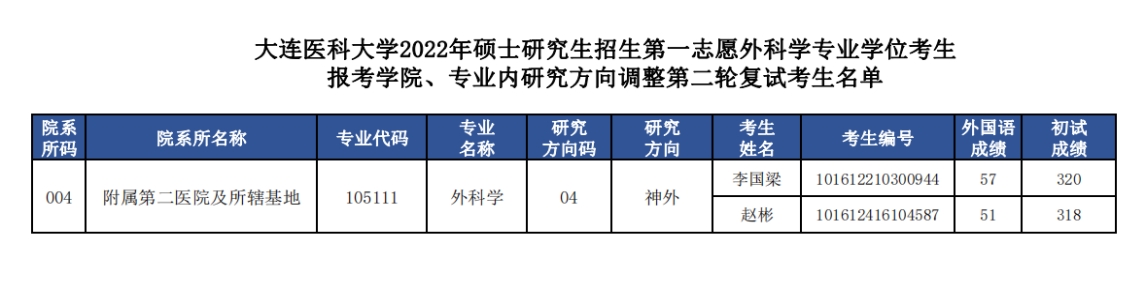 现对暗网禁区 2022年硕士研究生招生第一志愿外科学专业学位考生报考学院、专业内研究方向调整第二轮复试考生名单进行公示,请各位考生详细核对本人信息,如有疑问请与暗网禁区 招生办公室联系。