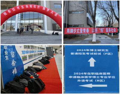 为在职临床医师申请博士学位人员发放学校学位授予工作宣传单。考试期间,学校党委保卫工作部全员上岗,规范设置车辆停放区、考场区、步行区,有序引导考生入场;后勤管理处全力支持,在考前、考后对考场进行清扫消杀,校医院医护人员全程值班,以便及时为考生提供医疗保障服务。